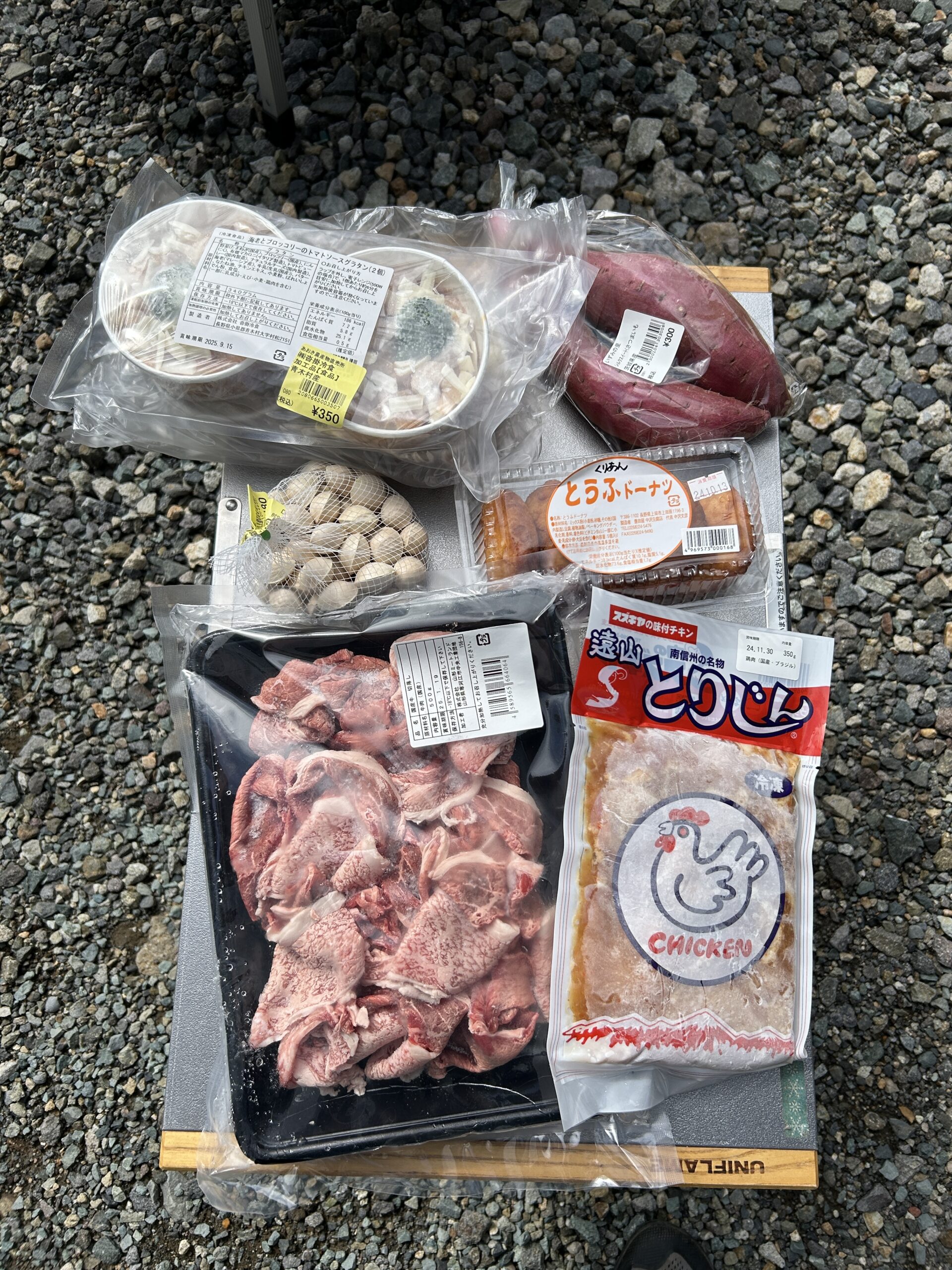 ついでに牛肉と鳥のジンギスカン、栗の豆腐ドーナツも購入。
