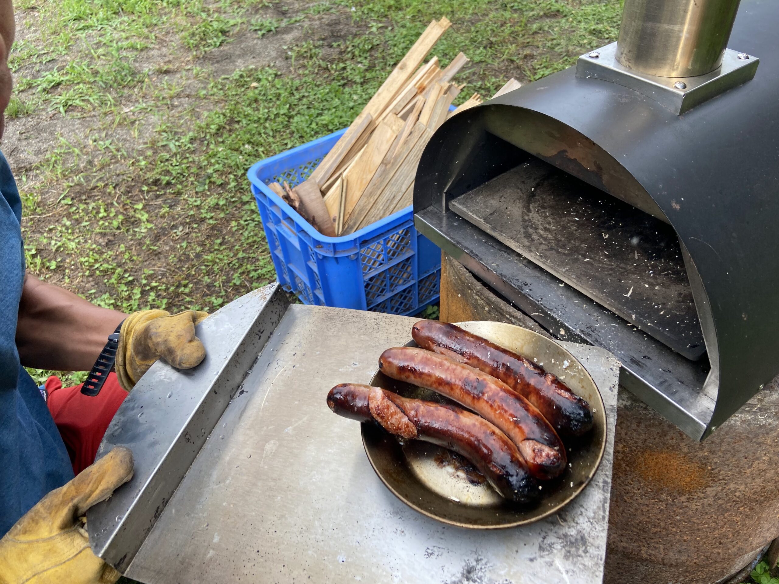 スキレットにソーセージを乗せ、ファイヤーサイドのピザ窯にIN